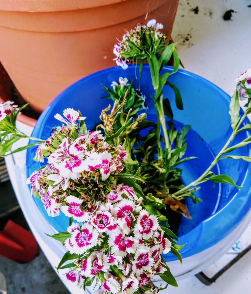 Als wir über den Friedhof in Richtung Ausgang gingen, trafen wir einen Mann, der im Grünabfall wühlte. Er suchte die noch gut erhaltenen Blumen raus. Eine stand noch in voller Blüte, die andere war teilweise vertrocknet. Von dieser pflückte er sich die Samen ab . Auf meine Frage ob er das öfter macht, antwortete er. Klar, ich ziehe mir aus den Samen meine eigenen Pflanzen und diese ( er zeigte auf die voll erblühte) setze ich mir in den Garten. Möchte sie auch Samen pflücken ? Er drückte mir den Topf in die Hand. Ich beschloss sie mit zu nehmen, sie zu wässern und ihr einen Platz auf meinem Balkon zu geben. Und natürlich Samen daraus zu ziehen ( wenn das mal klappt).