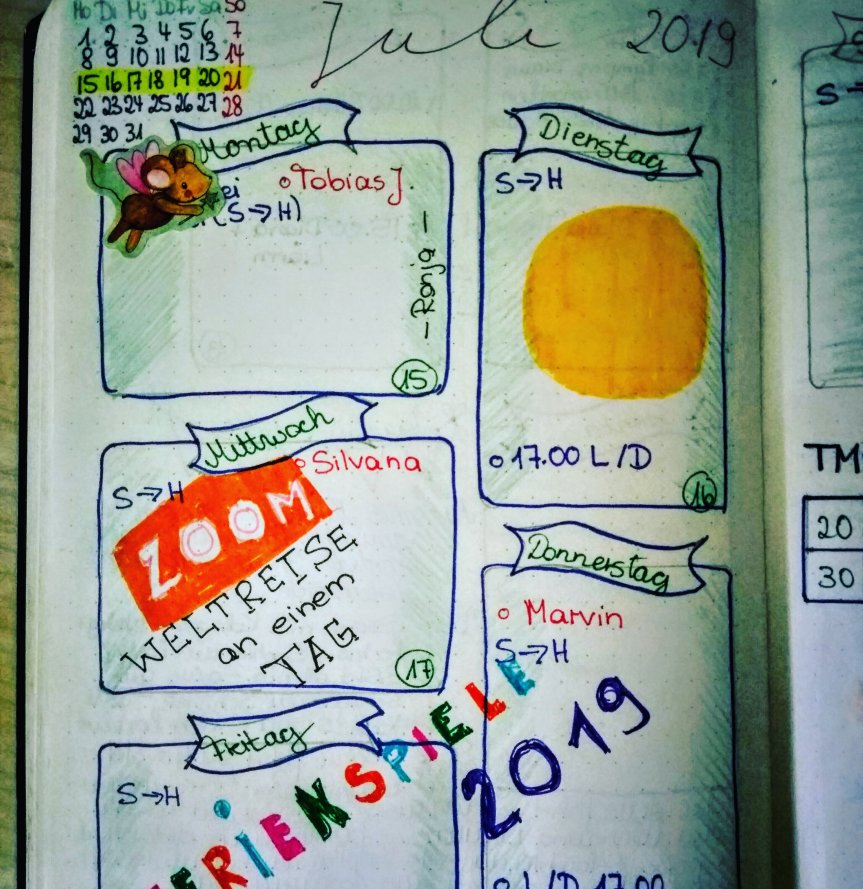 Ich liebe es die einzelnen Seiten zu gestalten. Im Hintergrund laufen die Vorbereitungen für den Monat August, gleichzeitig arbeite ich an der Gestaltung vergangener Wochen.