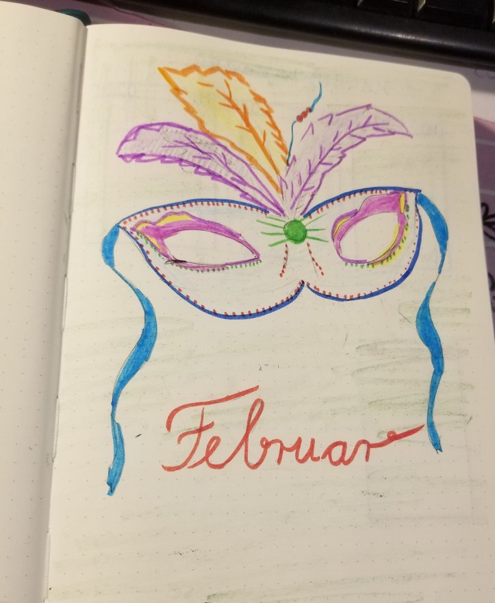 Bis auf die Gestaltung meines Bullet Journals bin ich in dieserm Jahr noch nicht wirklich kreativ geworden. Ich versuche in meinem Bullet Journal jeden Monat ein Thema aufzugreifen. Ende Februar ist Karneval, aber auch der Valentinstag hat seinen Platz gefunden. Sobald die Seiten fertig ausgestaltet sind, werde ich sie hier teilen. Mein Journal selber zu gestalten, ist immer so entspannend, dass ich die Zeit vergesse. Es macht einfach Spass. Manchmal gefallen mir meine Bilder am Ende gar nicht so gut ( wie hier zum Beispiel die Federn ). Doch niemand ist perfekt und man kann nur besser werden, wenn man übt.