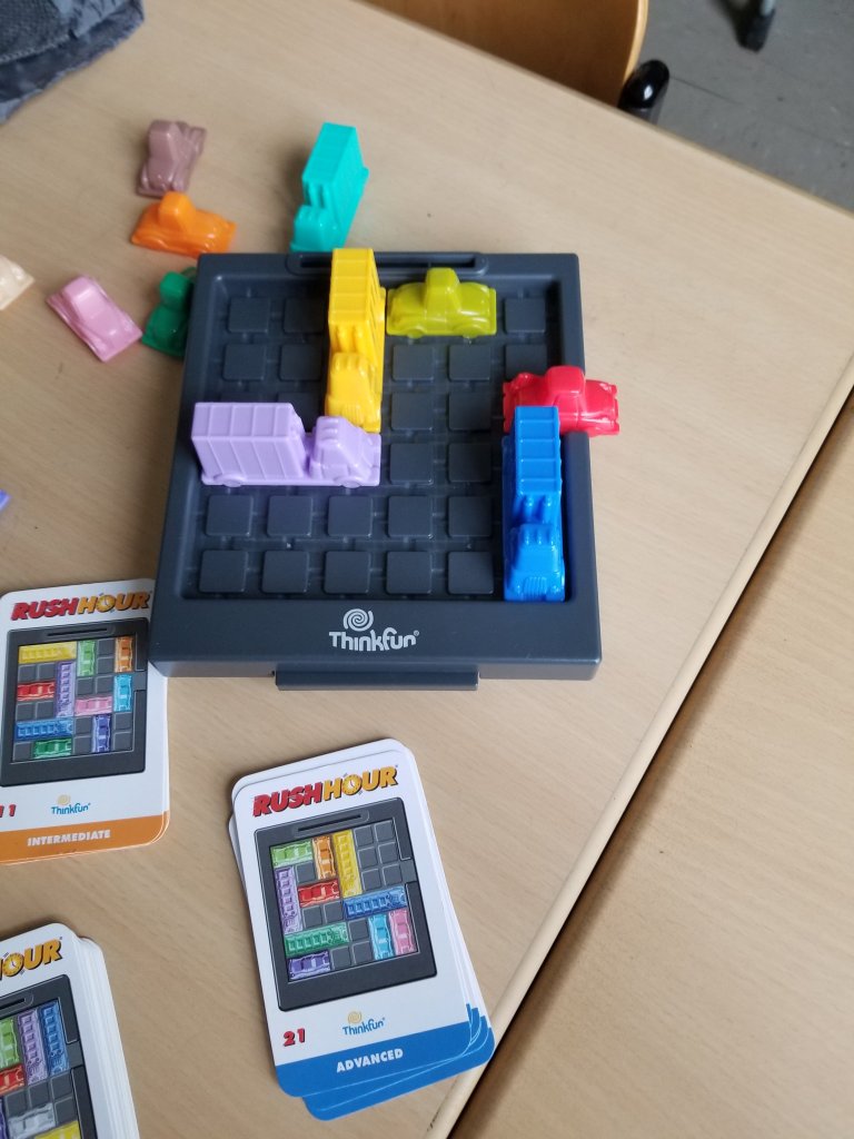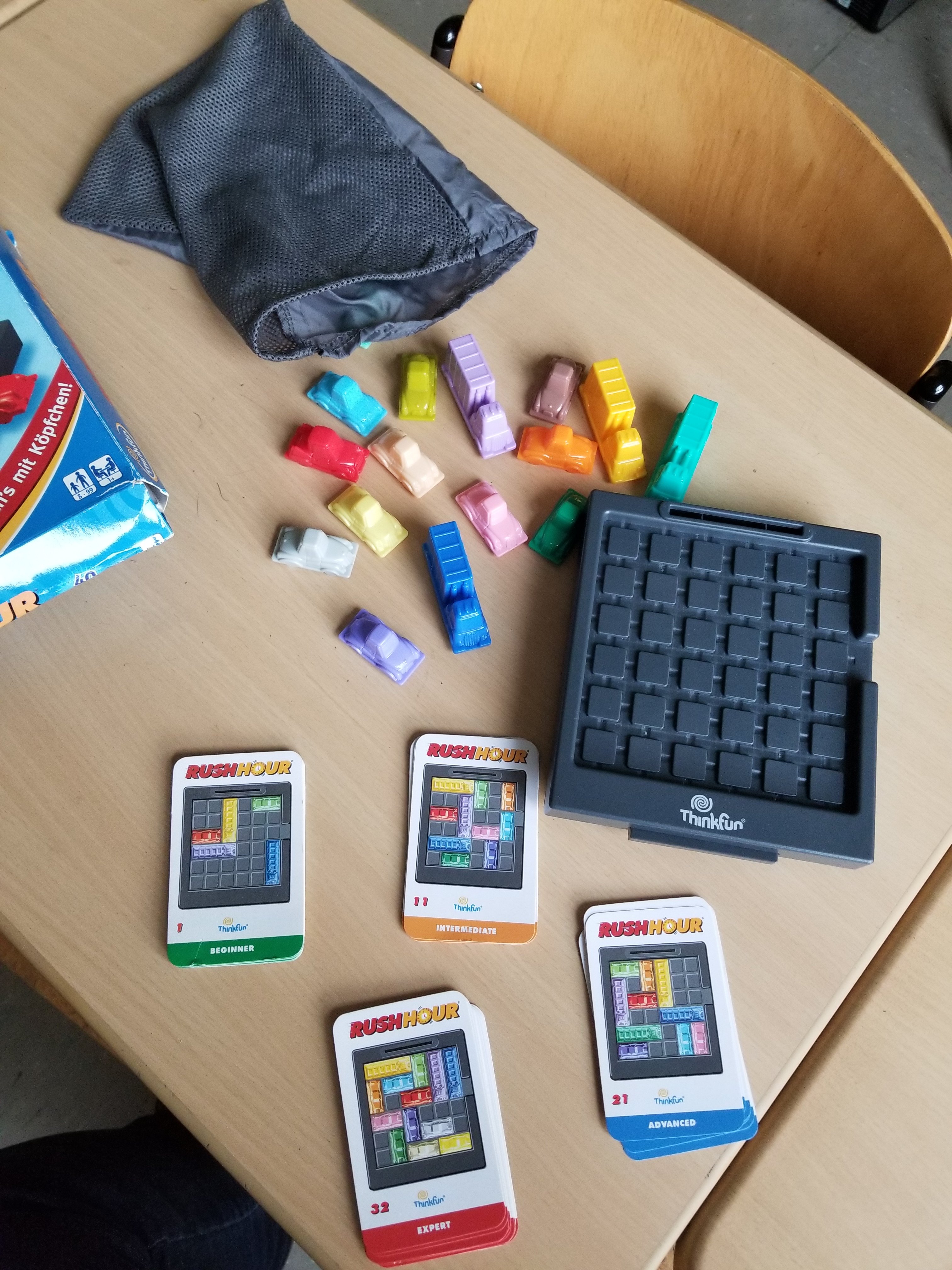 Bei Rushhour von Thinkfun/Ravensburger handelt es sich um ein Knobel- und Strategiespiel, das von einer Person alleine gespielt werden kann. Doch wie jedes Spiel kann es abgewandelt werden. Die Schüler meiner Gruppe, Erstklässler eine Grundschule, haben zum Beispiel heute versucht die Aufgaben zu zweit zu lösen.