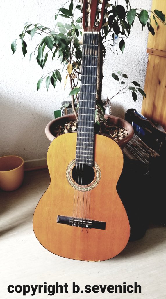 Ein Student gab mir damals Einzelunterricht und ich lernte nach Noten spielen. Lange hing sie an der Wand. Immer mal wieder habe ich sie genommen und gespielt, aber nicht wirklich intensiv und ich kann auch nichts wirklich. Dann hatte mein ältester Sohn Interesse, spielte später auch den Bass in einer Band und nahm sie beim Auszug mit nach Köln. Vor einem Jahr kam sie zurück und wohnte eine zeitlang bei der Löwentochter. Seit letztem Sonntag ist sie wieder zu Hause und wird von mir und dem Novemberkind genutzt. Ich hätte jetzt tatsächlich Lust, sie richtig spielen zu lernen.