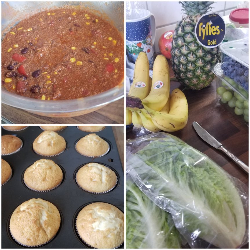 Auf Wocheneinkaufstour mit meiner Freundin war ich auch. Den Samstag nutze ich fürs Vorkochen, heute heißt es Meal Prep. Ich arbeite gerne mit einem Wochenplan und Einkaufszettel, nicht nur um Geld zu sparen, sondern auch, um nicht immer auf Fastfood zurück zugreifen. Links oben Chilli con Carne im Thermomix. Mir ist das Fleisch zu fein, dass werde ich nächstes Mal ändern. Rechts oben . Die Ananas wird noch zu Marmelade verarbeitet. Die Blaubeeren , Trauben und Bananen werden als Joghurt Zutaten genutzt oder kommen in den Obstsalat. Der Salat mit diversen Zutaten wird vorbereitet, so dass wir uns die „tollen“ Tütensalate hoffentlich bald sparen können.( Das Novemberkind liebt sie, weil sie so praktisch sind.) Die Muffins sind nicht glutenfrei und nur fürs Kind.