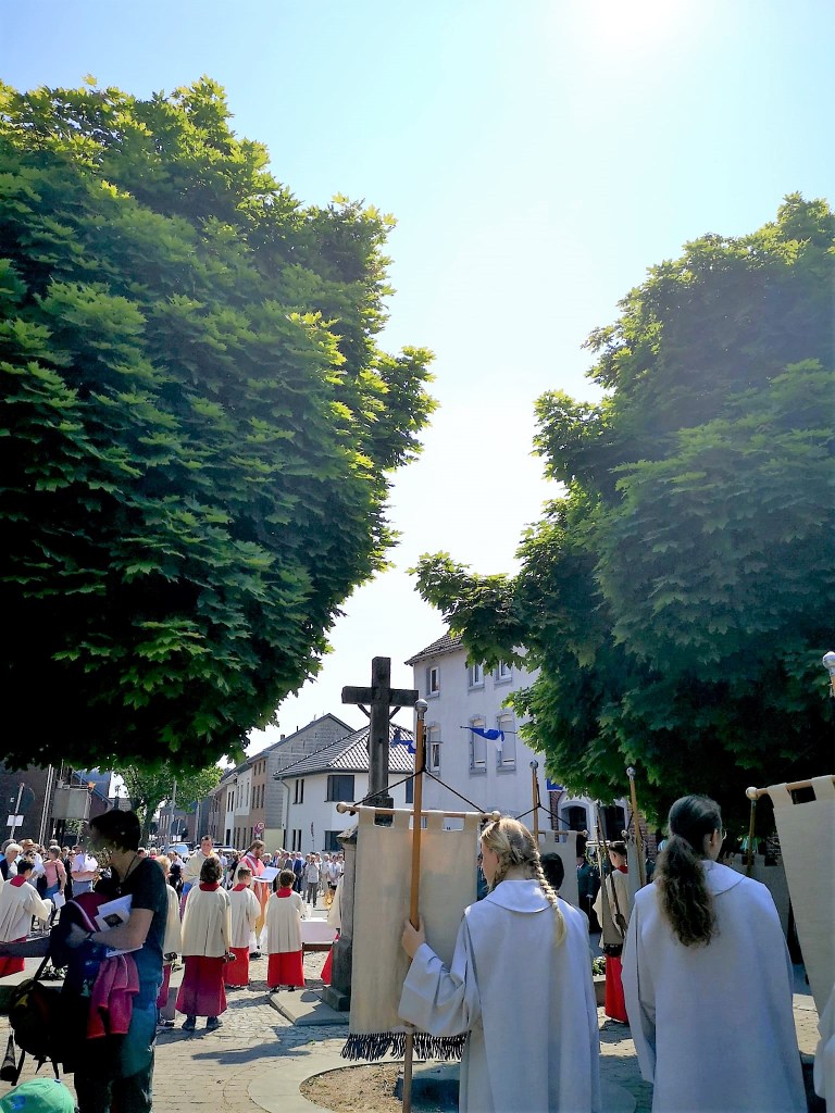 Gestern war Fronleichnam und zum ersten Mal seit vielen Jahren habe ich an der Prozession mitgewirkt. Es war ein sehr festlicher Anblick und die Perspektive des (neuen)Pfarrers auf die Geschehenisse des Tages ist anders, als ich sie bisher kannte. Man könnte sagen: Da laufen Menschen singend und betend durch die Straßen, für einige Teilnehmer eine Pflichtveranstaltung, für einige der Bestandteil ihres Glaubens. Aus Kindheitstagen kenne ich es noch so, dass Bürger entlang der Prozessionsstrecke vor ihren Haustüren kleine Altäre aufbauten .
