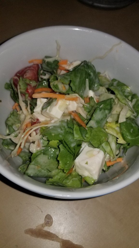 Abendessen. Der Salat ist fertig. Pommes mit Senf noch nicht.