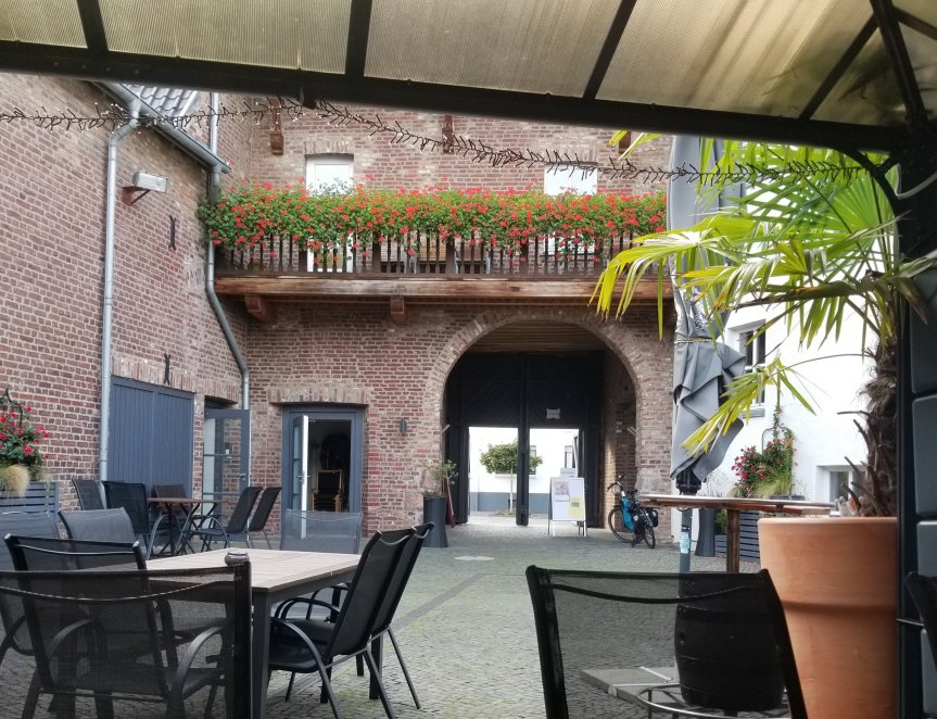 Dann erzähle ich mal kurz was du hier siehst. Die Kolleginnen und ich waren zum Essen verabredet. Es war warm genug um draußen zu sitzen Das Restaurant befindet sich in der ehemaligen Burg Baesweiler. Naja, Burg heißt der Ort immer noch.