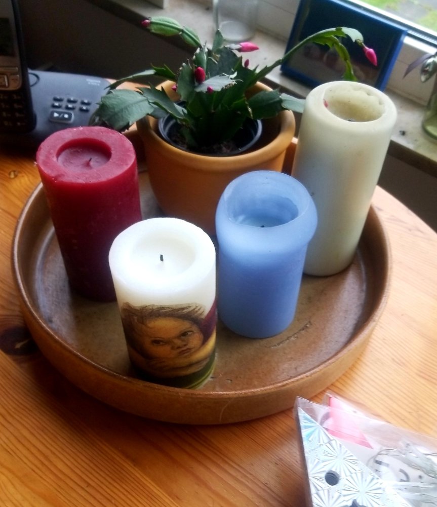 Auf der Suche nach Kerzen aus dem Vorjahr, um doch mal so langsam etwas adventskranzähnliches auf den Tisch zu stellen, bin ich auf dieses Ensemble gestoßen. Kommentar meiner Mitbewohnerin: Nee… muss das sein. Weihnachtsdeko. – Hallo, was ist daran bitte schön weihnachtlich ?