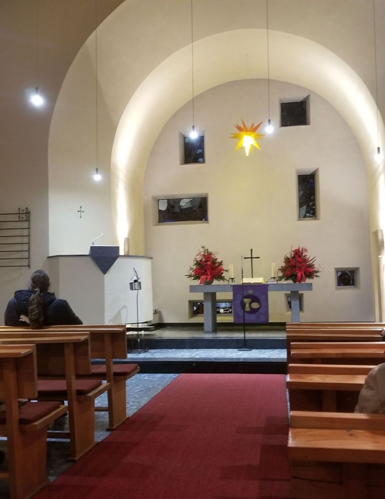 Am Morgen war der Adventsgottesdienst . Die dritte Kerze am grossen Adventskranz wurde von einer „Lucia“ angezündet. Viele Kinder waren in der Kirche. Der Pfarrer Dr. Denis Rokitta erzählte gemeinsam mit Lucia, die übrigens 1700 Jahre alt ist und aus Italien stammt, ihre Geschichte.