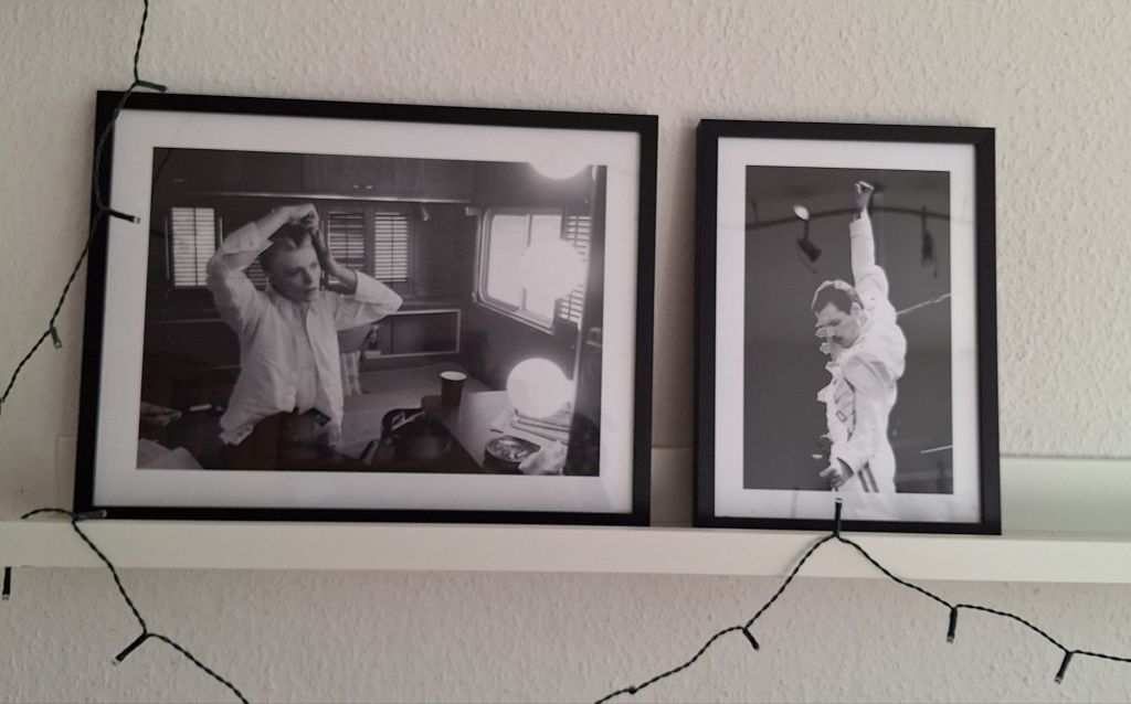Ich richte mir in meinem Wohnzimmer eine kleine „Musikecke“ ein. Die Musik dieser Old Stars steht noch auf Vinyl im Regal und es ist ein ganz besonderer Sound, wenn der Plattenspieler läuft. Bis der Märchenprinz Zeit hat, mir neue Löcher in die Wand zu bohren ( bei uns geht nix mit Hammer und Nagel), haben die Poster einen Ehrenplatz über dem Sofa.