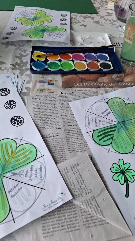 Also: Vorlagen ausgedruckt, Farbkasten ausgepackt, Stifte sowie Kleber bereitgelegt – und los ging’s! Jedes einzelne Kleeblatt wurde mit Liebe ausgeschnitten, gefaltet, bemalt. Marienkäfer, winzige Kleeblätter und allerlei andere Glücksbringer fanden ihren Platz. Vier Stunden später war die Karte fertig – und ich mehr als zufrieden.
