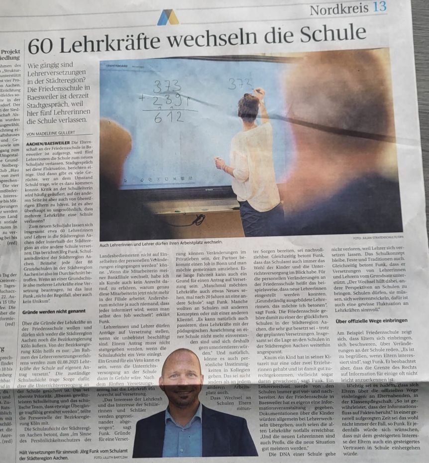 Unsere Schule steht in der Zeitung. 5 Lehrer haben uns zu den Sommerferien hin verlassen. Der Bericht spiegelt nicht wider, was sich hinter der Kulissen abgespielt hat. Näher darauf eingehen darf ich an dieser Stelle nicht. Interessant an dieser Stelle wie immer, nicht alles, was in der Zeitung steht, entspricht dem Erleben und dem Gefühl der Beteiligten. Und das macht die Sache so schwierig.
