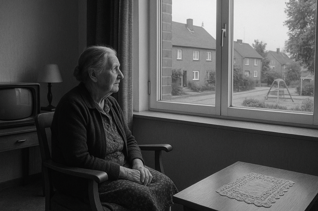 Vor meinem inneren Auge stieg das Bild vor mir auf, wie ich sie in Erinnerung habe. Als Kind habe ich sie immer sonntags mit meinem Vater besucht. Sie wohnte nur ein paar Straßen von uns entfernt, aber meine Mutter hatte entschieden, dass wir bzw. ich nur minimalen Kontakt zu ihr habe. Zur ganzen Familie meines Vaters. Meine Oma wohnte in einer Sackgasse, die Straße führte genau auf ihr Zechenhaus zu. Zwei Haustüren nebeneinander. Rote Backsteine. Der Eingangsbereich war eng, die Treppe nach oben beherrschte den Flur. Links ging es in das Wohnzimmer. Und dort saß sie immer in ihrem Holzstuhl und schaute in die Welt nach draußen. Sie sah die Straße, die zur Haupstraße führte, ein Spielplatz mit einem riesigen Kletterpilz und die Gärten der Häuser an der Hauptstraße und der Nebenstraßen.