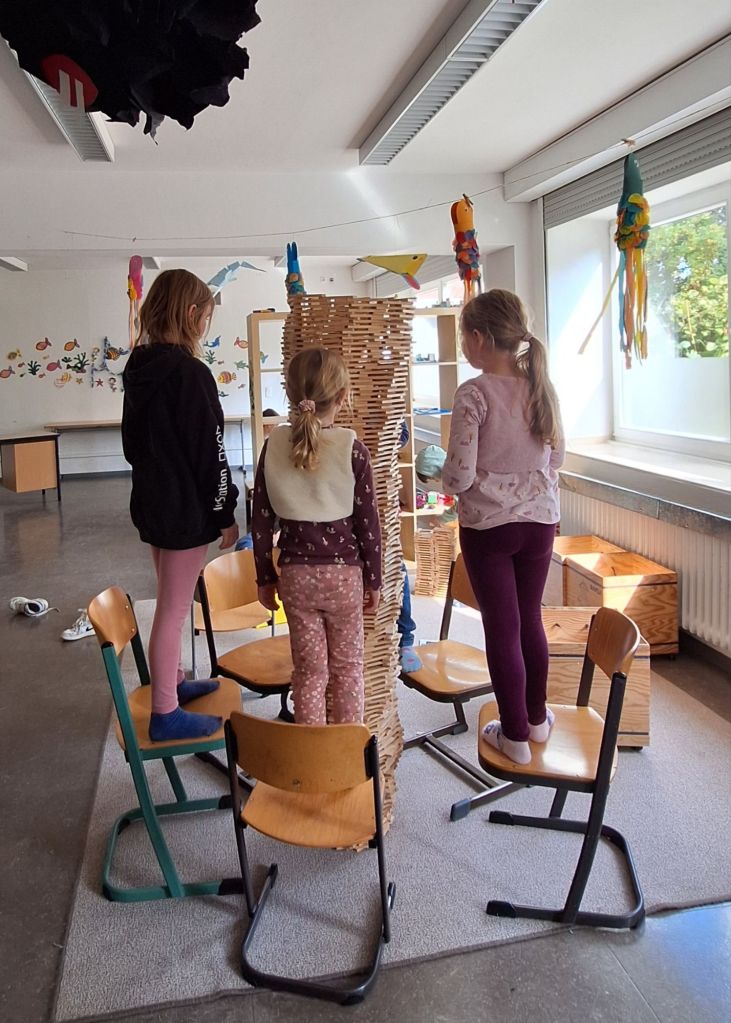 Ein Renner in der Betreuung sind immer wieder die Kapla-Steine mit denen riesige Türme gebaut worden. Nach Fertigstellung kommen die Kinder immer zu mir, damit ich sie und ihr Werk fotografiere. Anschließend stelle ich das Bild auf die Online-Pinnwand und sie können zu Hause ihren Eltern zeigen, was sie erbaut haben.