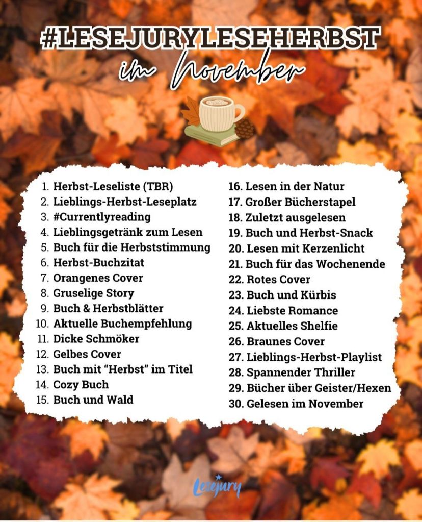 Durch Zufall bin ich auf die #LeseJuryleseherbst Aktion im November gestoßen. Ich hatte sie gar nicht mehr auf dem Schirm. Mal sehen, wie viele Aufgaben ich dieses Jahr erfülle. Letztes Jahr habe ich mir leider keine Notizen gemacht, sondern nur bei Instagram in den Stories etwas gepostet. Die Frage ist: Wen interessiert es?
