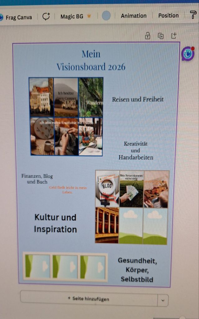 Heute habe ich mir bewusst Zeit für mein Visionsboard 2026 genommen. Jedes Jahr nehme ich mir vor, es endlich umzusetzen – und jedes Jahr scheitert es daran, dass ich mir dafür keinen echten Raum schaffe. Heute war es anders: Ich habe begonnen.