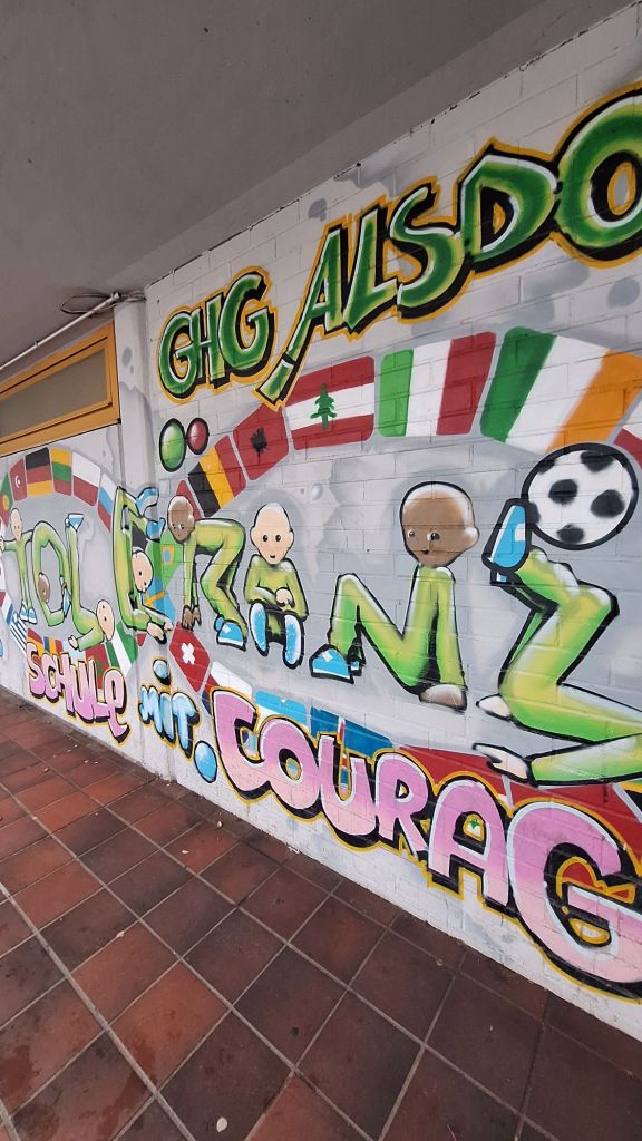 Axel vom Blog „warumichradfahre“ hat meinen Blick noch einmal neu justiert – ich achte mehr auf Street Art. Seitdem gehe ich mit offeneren Augen durch den Alltag . Die Fotos auf dieser Seite sind an den Wänden der Schule entstanden.